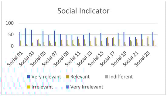 Participants were asked in the questionnaire to classify each indicator according to relevance. It was perceived through the social indicator, that in general, all indicators were considered with some level of relevance. Sub-indicator 2, access to high-quality education, stands out, and obtained the highest number of Very Relevant. This may demonstrate the population’s concern regarding this issue. Additionally noteworthy is sub-indicator 20, Accident mortality rate, with the highest number of Indifferent. Indicator 4, Informal settlement area, with the highest number of Very irrelevant. These results may have occurred due to a lack of knowledge about the municipality’s data in relation to these topics, or even because it had little effect on the respondents’ daily lives.