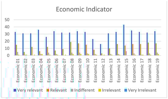 Regarding the Economic indicator, all indicators received a high rating of Very Relevant. Sub-indicator 15, Market Size, was the indicator with the highest number of Very Relevant, but also the indicator that received the highest number of Indifferent, demonstrating that the sample had people with different interests. None of the indicators were classified as Very Irrelevant by any respondent.