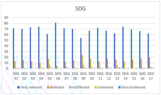 The environmental indicator also received a large number of Very Relevant in all sub-indicators, but the highest ranked sub-indicator is 13, Household waste treatment fee. It is noted that, in the city of Florianópolis, new systems were implemented for the separation and collection of domestic waste, with entire condominiums joining in together with advances in selective collection. Therefore, this theme becomes a part of people’s daily lives and, naturally, there is an expectation of the population for the correct treatment of household waste. Still, at least ten people considered sub-indicator 9, Soil quality, as Indifferent. Possibly, the reason for this is that the city’s economy is related to information systems, services and tourism, and is on an island where there are many fishermen with seafood production interests rather than agricultural use of the available land. This indicates that only a small number of people engage in planting activities in Florianópolis, and those who do mostly maintain small gardens or isolated farms. The SDG was also verified among the population (sample) of Florianópolis in order to verify which sub-indicators were considered relevant. Figure 5 presents the results of the classification carried out by the sample of the population of Florianópolis regarding the relevance of the SDG.
