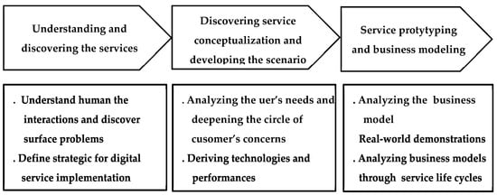 Economics traditionally deals with a clear distinction between goods and services. Goods are tangible and consumable products, while services are instantaneous exchanges that are intangible without resulting in ownership. An experience occurs when a customer has used some tangible product offered by a service provider []. Each scholar has a different definition of service design. The term service design is one of the methodologies used to describe the whole process, from idea to specification []. Service design has been narrowly defined as the specification of service concepts, such as drawing a picture that includes the functions of products or flow charts [].