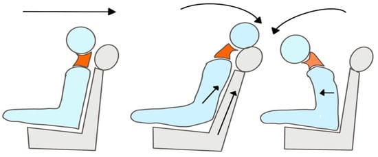 Active headrests can effectively protect against neck injuries. They have come to be popularized to the point of being used in almost all automotive seats. Depending on the design principle and mechanism of operation, services can differ in terms of how they are activated. Figure 5 shows how reactive headrest seats work by alleviating the power of collisions through an existing link when power hits the seatback and moves forward to the headrest. At this point, due to the rotation of the headrest, the head, which is moving backward, is struck.
