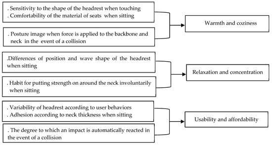 As mentioned earlier, the key role of the service scenario (see Figure 6) is composed of service selection, service technology, and a customer journey map, which is divided into a core group and a sub-group to match synchronization with what the customer wants as much as possible. The first functionality, including technical feasibility, is to check whether it has the original function of a headrest, i.e., preventing neck injury in the event of a rear collision.