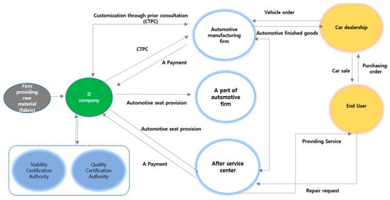 In summary, service creation as the ultimate goal of producing a new design of a headrest is achieved through the following steps: First, a service concept is derived. Second, a research target is set, and the ideation process is carried out accordingly. Third, a service scenario is created in which the product will be provided. In this process, key services are determined among alternative services. Fourth, a service design is created as a form of service prototyping. Finally, business modeling determines different models for each customer’s requirements. Figure 7 shows that D firm has an extent the business partners e.g., automotive manufacturing firms through the incessant service creations.