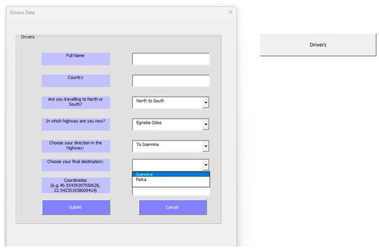 For the truck drivers, information on their position would act to avoid diverting them from their route and could reduce solution processing time by focusing on a subset of the 47 parking areas, i.e., on the ones located in the driver’s route and meeting driver’s needs. In the drivers’ user form, eight labels, three text boxes, and five combo boxes are connected to each other. The form includes two command buttons (Submit, Cancel) and consists of a 4-level drop-down list based on the pre-defined routes (Table 5). The driver responds to the following questions: “Are you travelling to North or South?”; “Ιn which highway are you now?”; “Choose your direction in the highway:”; and “Choose your final destination; but the driver can only see the available options based on his previous statement. Indicatively, if the driver states that he is moving from North to South on Egnatia Odos, only the directions “To Thessaloniki” and “To Ioannina” will be available in the third level. Additionally, the driver declares his full name, the country, and his coordinates. The user form is initiated with the “Drivers” button (see Figure 1).