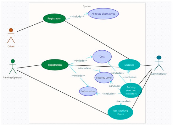 The main use case of the system is shown in Figure 2. It is launched when the driver presses “submit” on the registration form (user form), and no provision has been made for users who only partially respond to the route data requested. The driver has an equal chance of choosing any of the 22 routes (4.55%). The system stores the input data. Static data are based on a geographic reference state. The system uses geographic coordinates, a 2-dimensional system (latitude and longitude). Each user, driver, or parking area manager inserts the geographic coordinates. The stored location data are used by the system to calculate the distance between the available parking areas and the registered truck driver. Then, the characteristics of the parking space (security, cost, service provision) allow calculating the most suitable parking space. Finally, the system maintains the historical data.