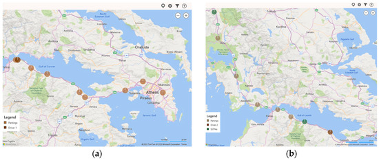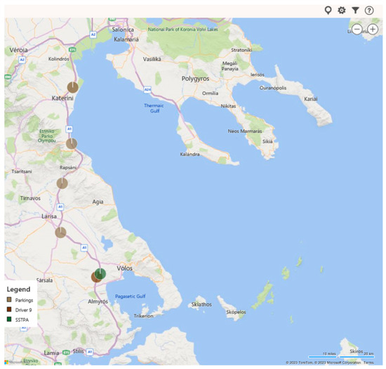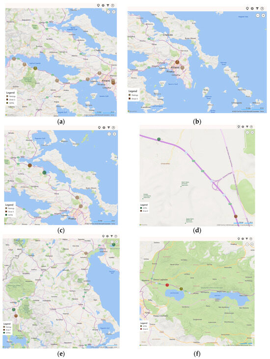 In Figure 4a, the location of Driver 3 and that of the relevant available parking areas for the route are depicted. The driver is on Attiki Odos and heading towards Patras, with seven parking options available along his route. The system has responded correctly, as it does not suggest parking areas that would divert Driver 3 from his route. From all maps, it was ascertained that, for all drivers in this application, the system proposed the proper truck parking areas along the driver’s route (Figure 4b–f and Figure 5).