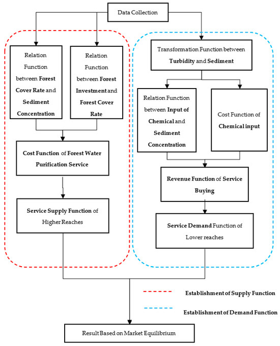 The Loess Plateau of Yellow River basin (LPB), located in the middle reaches of the Yellow River, has played a crucial role in the nation’s social and economic progress and is an important drinking water source for around 200 million people in the lower reaches; however, the severe issue of soil erosion has been a longstanding challenge in this region, which has posed a significant threat to the livelihoods of people in the lower reaches for thousands of years [18]. LPB has been responsible for approximately 90% of the sediment load carried by the Yellow River [19], so its forest purification service significantly affects the quality of downstream water. In this paper, a market-based analytical framework is proposed to stimulate the service trade mechanism between an upper-reaches supplier and a lower-reaches demander in a horizontal compensation program. The framework was applied to the LPB to predict the potential economic benefits of horizontal compensation there, which helps to fill the knowledge gap and is conducive to the realization of horizontal ecological compensation. The remainder of the paper is organized as follows. In Section 2, we construct our analysis framework, mainly including basic elements, essential hypothesis, mathematical derivation process, and derivation result. In Section 3, we apply the analysis framework on our study area and acquire the potential trade surplus there, the main process can be described as the flowchart of Figure 1. In Section 4, we conclude our study and discuss its policy implications.