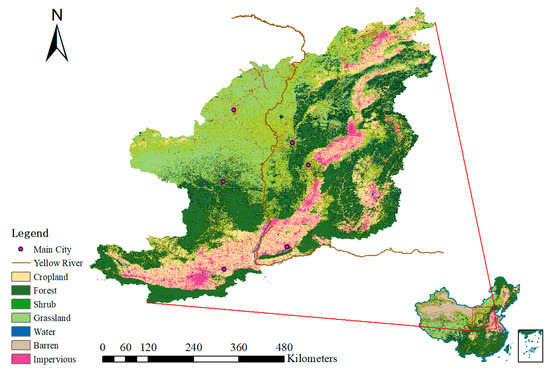 The forest cover rate was mainly calculated based on geographic information data. First, we extracted the land use data of the LPB area (Figure 2) from Huang’s 30 m resolution land use data of China [30]. Then, we divided the forest cover area of the LPB by the total area of the LPB to obtain the forest coverage rate. We conducted this operation year by year from 2000 to 2019 to obtain annual forest cover rate data. All of the above calculation processes are based on the software ArcGIS 10.8.