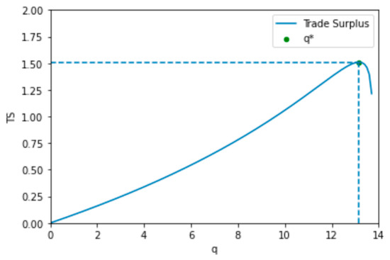 Equations (19) and (26) form a trade system. The upper-reaches supplier and lower-reaches demander, as rational agents, will bargain with each other until the system reaches an equilibrium. Then, we can obtain the equilibrium intersection point , where and . In the equilibrium state, the TS will reach its summit (Figure 3), and social welfare reaches its optimal state.