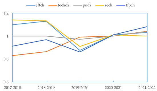Malmquist can reflect the dynamic change in efficiency by observing the changes in productivity between this term and the next term [62]. Under technical conditions of term t, the technical efficiency changing from the term t to t + 1 can be calculated using Equation (13).