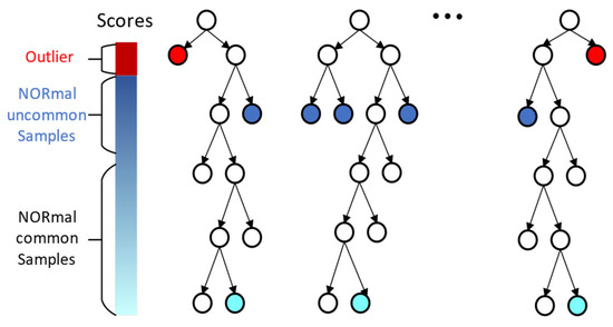 The Isolation Forest algorithm utilizes binary trees to partition the data, and the depth at which a data point lies in the binary tree reflects its level of “isolation” [34]. The decision-making process of the algorithm is illustrated by Figure 1.