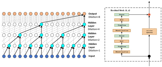 Temporal convolutional neural network (TCN) [40] is a deep learning model used for handling time series data. It consists of causal convolution, dilated convolution, and residual connections, as illustrated in Figure 3. TCN exhibits the following characteristics when dealing with time series data.