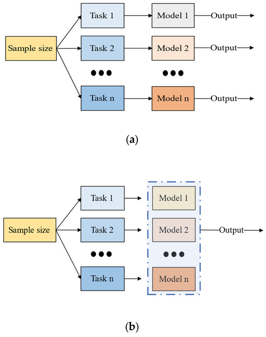 The multi-task learning mechanism [42,43] involves simultaneously learning multiple related subtasks within a learning framework, which enables the sharing of learned information throughout the learning process. Compared to single-task learning, multi-task learning is able to better extract the coupling relationships that exist among multiple tasks. This avoids the handling of complex real-world problems, such as independent subtasks in single-task learning, followed by merging and superimposing the results, which neglects the rich information pertaining to the relationships between subtasks. Figure 5 illustrates the principles of a single-task versus a multi-task learning mechanism.