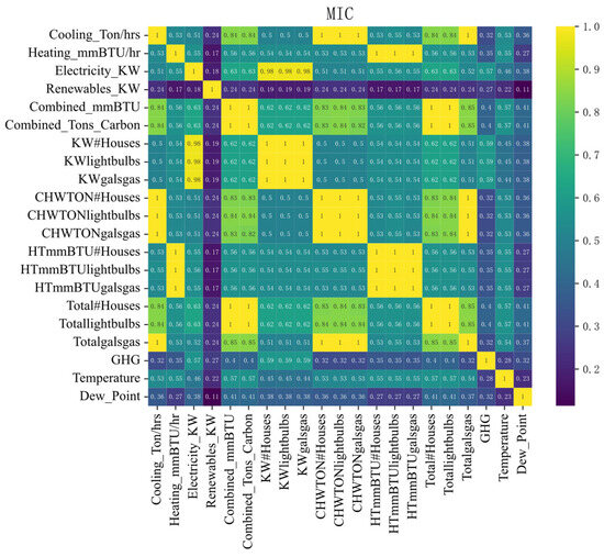 The maximal information coefficient (MIC) method [54,55] can measure the strength of both linear and nonlinear associations between data, allowing for the discovery of diverse types of relationships among different types of load data. Therefore, in this study, the MIC is used to analyze the spatiotemporal characteristics of multiple systems and to construct a high-dimensional feature matrix for model inputs. Figure 10 presents the MIC heatmaps for various systems, including the electric energy system, cooling system, heating system, and weather system.