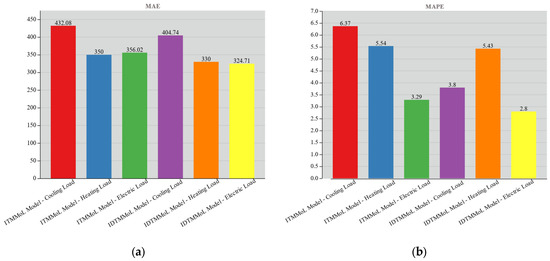 As shown in Figure 15, the prediction error results of the IDTMMoL model and the ITMMoL model proposed in this paper show that the MAPE index of the cooling load, heating load, and electric load are reduced by 2.57%, 0.11%, and 0.49%, respectively. The MAE error value of the cooling load, heating load, and electric load are also reduced to a certain extent. It can be seen that after adding the dynamic orbit module, the prediction errors of the cooling load and electric load are significantly reduced. The reason is that the dynamic orbit method can effectively eliminate the outliers hidden in the time series sequence, thus reducing the interference of outliers with the neural network and improving the prediction accuracy. Therefore, our proposed model has a better prediction effect.