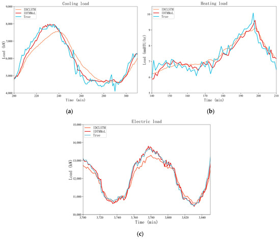 As shown in Figure 16, we show the performance comparison of the IDCLSTM model and the IDTMMoL model on the test set for a certain period of time for cooling, heating, and electric loads. It can be seen that in the prediction effect of the electric load, the proposed IDTMMoL model and the traditional multi-task IDCLSTM model can achieve a better prediction effect, and the prediction curve has a higher degree of fit to the real curve. The IDTMMoL model shows a better prediction effect than the IDCLSTM model. However, through the comparison of some details, the IDTMMoL model can still maintain a good fitting effect in the part where the curve fluctuates violently and the predicted value is closer to the real value, while the prediction error of the IDCLSTM model is improved, and the fit is not good.