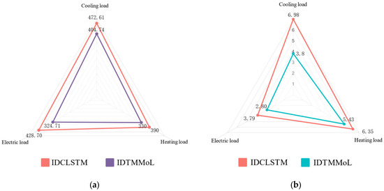 The error comparison diagram of the two comparison models is presented by Figure 17. It can be seen here that our proposed IDTMMoL model performs better than the IDCLSTM model in the test set’s cooling, heating, and electric loads, and the MAPE error percentage and MAE error value are reduced. This also shows that the TCN layer in the IDTMMoL model can obtain the feature information of the long time series more than the CNN layer of the IDCLSTM model and mine the data. When the feature information is introduced into the LSTM layer, the LSTM unit layer in the IDTMMoL model can better refine these temporal and spatial features. Therefore, the prediction effect of our IDTMMoL model is better.
