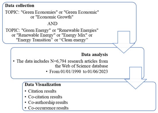 The utilization of the Web of Science database played a crucial role in granting us the opportunity to access a wide range of peer-reviewed articles sourced from reputable entities. Utilizing this methodology greatly enhanced the dependability and robustness of our research outcomes. In addition, including a significant body of scholarly articles totaling 6794 enhanced the comprehensiveness of our literature review. It allowed for thorough examination of the research landscape concerning the relationship between renewable energy and economic growth. To obtain a visual depiction of our research methodology, please consult Figure 1.