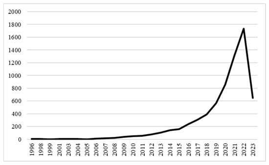 The analysis of publication trends offers significant insights into the research landscape and scholarly interest pertaining to the intersection of renewable energy and economic growth. According to the data presented in Figure 2, there is a steady upward trend in the quantity of publications from 1996 to 2023. From 1996 to 2006, Martinez-Duart and Garcia-Muros observed that the annual publication count ranged from four to ten, suggesting a reasonable degree of research engagement throughout that period [13]. From the mid-2000s forward, a noticeable surge in the number of published works became evident. Since 2010, there has been a notable surge in research productivity, which serves as evidence of an expanding scholarly fascination with the subject matter [13]. In the year 2010, the number of publications exceeded 50, and it exhibited a consistent upward trend in subsequent years.