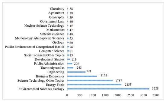 The inclusion of Business Economics (17.228%) and Engineering (10.608%) as notable fields of study indicates the acknowledgment of the economic and technical dimensions of renewable energy’s contribution to fostering sustainable economic development [32,33]. The aforementioned fields of study have made significant contributions towards comprehending the economic ramifications, market dynamics, and mechanisms of innovation pertaining to the incorporation of renewable energy sources. Furthermore, the incorporation of fields such as Thermodynamics, Public Administration, Development Studies, and other areas within the Social Sciences showcases a thorough investigation into various aspects of renewable energy deployment. This includes the assessment of thermodynamic efficiency, policy frameworks, governance structures, socioeconomic dimensions, and social acceptance [34,35].