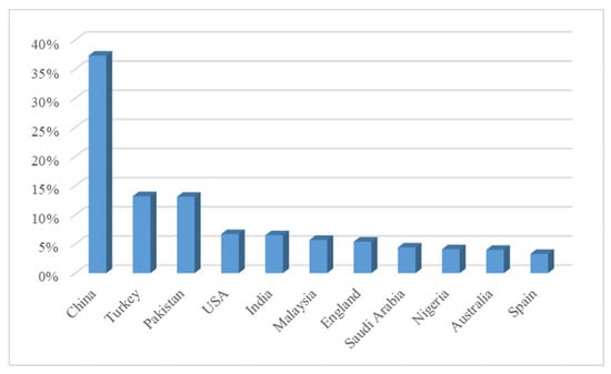 The analysis of the spatial distribution of scholarly articles pertaining to the relationship between renewable energy and economic growth offers significant scholarly contributions in terms of understanding the regional emphasis of research endeavors within this domain (refer to Figure 4). China has emerged as the primary contributor, representing 37.3% of all papers, which signifies the country’s substantial research endeavors and increasing focus on renewable energy as a catalyst for sustainable economic development. Turkey and Pakistan are ranked second in terms of the percentage of publications, with a share of 13.1%. This underscores the importance of these regions in contributing to the knowledge and exploration of the potential of renewable energy in fostering economic growth [38]. The United States and India exhibit notable involvement and commitment to research on renewable energy and its potential impact on economic growth, as evidenced by their respective shares of 6.7% and 6.5% in publications related to this field. These countries have acknowledged the importance of shifting towards renewable energy sources and have achieved notable progress in terms of policy and technological breakthroughs in this domain [12,39]. The presence of Malaysia, England, Saudi Arabia, Nigeria, Australia, and Spain in the distribution is indicative of their dedication to investigating the impact of renewable energy on attaining sustainable economic development.
