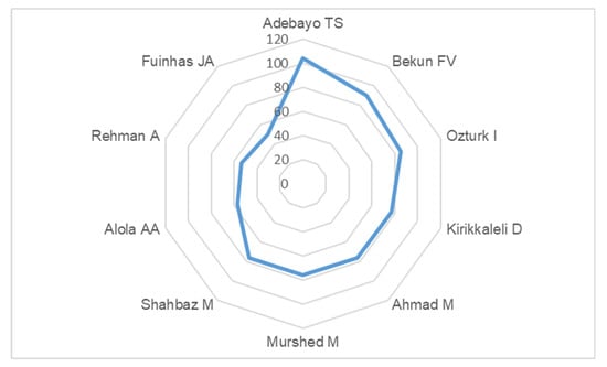 Scholars such as Andrew Alola Adewale, Lin Boqiang, Jose Alberto Fuinhas, and Daniel Bal-Salobre-Lorente have made noteworthy academic contributions, as evidenced by the number of documents and citations associated with their work. Specifically, Andrew Alola Adewale has authored 51 documents with 3237 citations [46], Lin Boqiang has authored 47 documents with 2050 citations [54], Jose Alberto Fuinhas has authored 44 documents with 932 citations [55], and Daniel Bal-Salobre-Lorente has authored 43 documents with 2906 citations [45]. The individual’s active involvement in the field is substantiated by their research productivity and impact, thereby attesting to their valuable contributions.