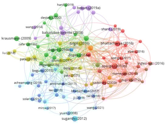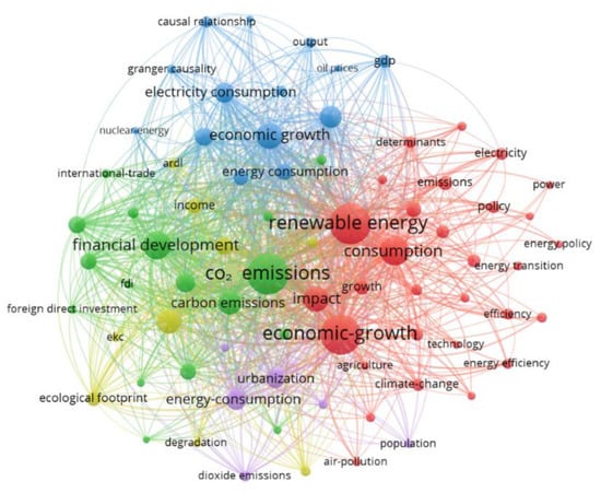 In the context of this comprehensive framework, citation analysis served to shed light on the scholarly terrain, directing our attention toward influential works and esteemed authors who have made significant contributions to our understanding of the interdependent connection between economic growth and renewable energy [12,13]. Upon further examination, the practice of co-citation analysis reveals thematic clusters, thereby exposing the complex interweaving of research ideas and highlighting significant areas of study [22]. This approach effectively demonstrates the interconnectedness of research concepts, elucidating the core of essential research domains.