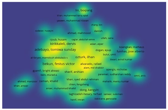 The examination of co-authorship offers useful insights into patterns of collaboration and the impact of writers in the realm of renewable energy and economic growth, as illustrated in Table 2 and Figure 7. The individual in question is Tomiwa Adebayo. According to Adebayo, Sunday is recognized as a highly productive author, having made substantial contributions to a total of 95 articles and garnering an impressive number of citations, amounting to 3845 [51]. These statistics not only highlight Sunday’s extensive research output but also underscore their substantial influence within the academic community. Bekun, Festus Victor has made significant contributions to the research domain, as evidenced by his extensive publication record of 80 articles and a total of 4564 citations [46]. According to Ozturk’s findings, Ilhan Ozturk is positioned in the third place in terms of research production, with a total of 74 documents [52]. Additionally, Ozturk has accumulated 7673 citations, indicating a significant level of scholarly significance.