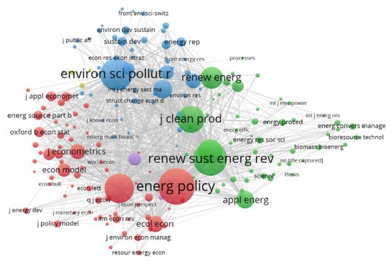 The journal “Energy Policy” holds the highest number of citations, with a total of 29,344 and a substantial link strength of 1,494,010, making it the most frequently referenced source inside the co-citation network. The influence of renewable energy in impacting research and policy considerations around economic expansion is evident. “Renewable and Sustainable Energy Reviews” exhibits its significant influence in the field, as seen by its substantial citation count of 24,588 and a total link strength of 1,276,801.