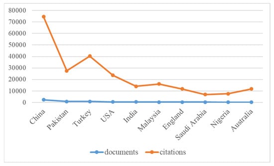 The examination of bibliographic coupling reveals the presence of joint endeavors and the exchange of knowledge among nations, highlighting their impact on intellectual pursuits. China is the leading contender in document count and citations, with Pakistan, Turkey, the United States, and India following suit. These countries demonstrate exceptional levels of research productivity and significant academic influence. In addition, it is noteworthy that Malaysia, England, Saudi Arabia, Nigeria, and Australia make substantial contributions to the scholarly literature on this particular topic.