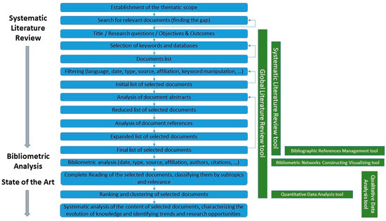 Figure 1 lists SLR, BA, and SOTA, discretizes and sequences the steps involved, identifying the most significant feedback, and indicates the support tools typologies for the different phases of the process. In our particular case, the Global Literature Review tool was StArt [14], the Systematic Literature Review tool was PRISMA [15] (see Supplementary Materials), the Bibliographic References Management tool was Zotero [16], the Bibliometric Networks Constructing and Visualizing tool was VOSviewer [17], the Qualitative Data Analysis tool was NVivo [18], and the Quantitative Data Analysis tool was SPSS [19]. Although the referred tools coincide in some of the functionalities they present, at each stage of the process, an attempt has always been made to use the most appropriate one. Note that for each of the functionalities in question, there are several other tools available on the market.