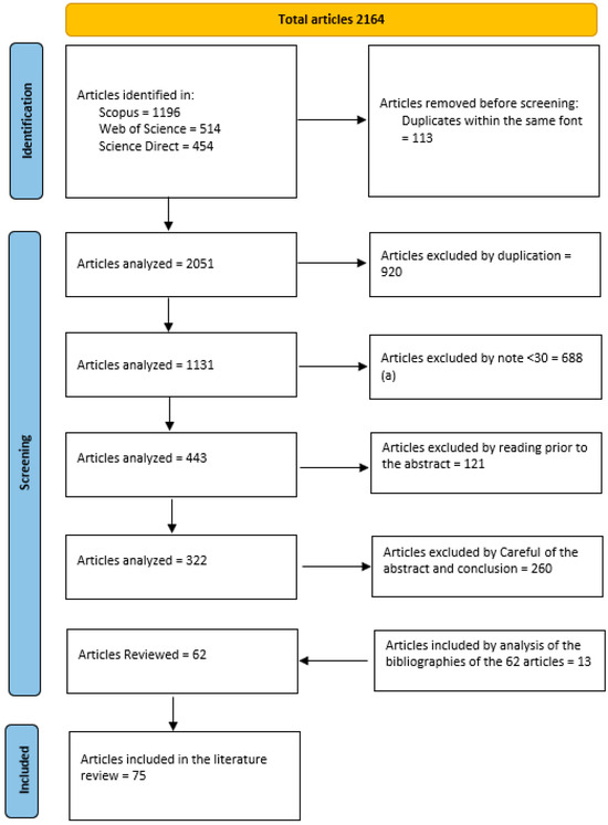 The last stage of the selection process of articles in the SLR was then carried out. It involved an analysis of the bibliography of the 62 selected articles, analyzing only the titles, reading the abstract and its conclusion, and including 13 more articles for the totality of texts to be analyzed, thus totaling 75 articles. The 13 articles that were added all have a consumer theme, unfolding the themes into consumer perception [20,21], consumer intentions [22,23,24,25], and consumer attitudes [26,27,28,29,30].