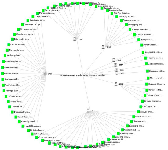 More recently, the authors tried to validate the previously obtained list of sub-themes, having carried out a new search in the Scopus database, which had proved to be predominant throughout the investigation conducted. With the expressions “circular economy” and “consumer” present in the title, abstract, or keywords, 1840 articles were found. For each of the sub-themes in question, three more expressions were added (presented below, in the text), requiring that at least two of them be present in the title, abstract, or keywords. The various sets of three expressions used resulted from the knowledge and sensitivity accumulated over the previous stages of the investigation.