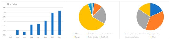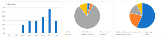 Regarding this sub-theme, the search words, Green Products, Environment, and Biodegradable, were considered. As can be seen in Figure 10, regarding this subtopic, articles have only been published since 2019, there is a predominance in the origin affiliation of the authors—Europe—and the thematic area of the articles—Engineering.