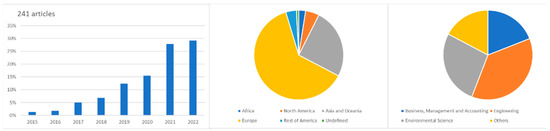 Regarding this sub-theme, the search words, Sustainability, Future generations, and Resources, were considered. As can be seen in Figure 11, there has been an increase in the number of articles published in relation to this subtopic, and there is a predominance in the origin and affiliation of the authors—Europe—and in the thematic area of the articles—Engineering.