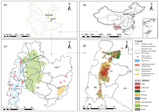 The geographical location of the study area. (a) Map showing the location of Yunnan in China. (b) Map showing the location of SYAC in Yunnan. (c) Map showing basic information about SYAC. (d) Map showing the distribution of land-use in the urban area.