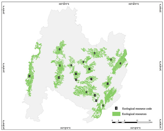 At the level of the urban area, with the service objective as the guide and the supply function, regulation function, and cultural function of the patches as the focus, Shilin protected natural areas and Ashima Cultural and Ecological Park were selected as objects of cultural ecological resources, the core area after MSPA analysis was selected as of natural ecological resources, and the two were analyzed for landscape connectivity, and the patches with dPC > 5 were selected as ecological resources. As shown in Figure 6, the total area of ecological resources in the urban area is 22.3209 km2, which is mainly distributed in the northern and central parts of the urban area. The vegetation coverage in this area is high, and the land-use types are mostly forests, grasslands, and villages; the intensity of human development is low.