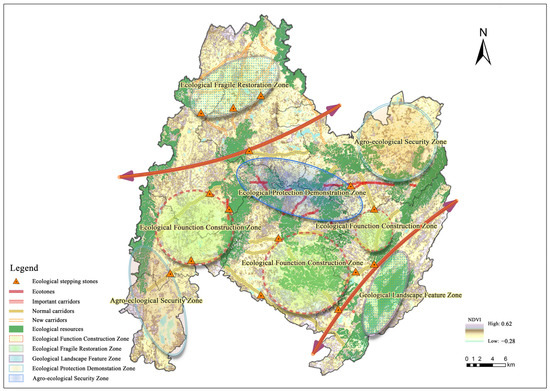 At the county level, we divided the study area into five major divisions: an Ecologically Fragile Restoration Zone, a Geological Landscape Feature Zone, an Agro-ecological Security Zone, an Ecological Protection Demonstration Zone, and an Ecological Function Construction Zone. Then, the county ecological network is nested with the ENs of the urban areas to identify three main zones within the urban area: a Priority Recovery Zone, a Material Exchange Conversion Zone, and Ecological Stepping-Stones.