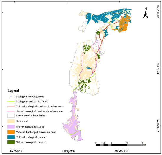 The ecological resources at both the county and urban area levels were nested to obtain the Material Exchange Conversion Zone (Figure 6). This area is located in the northeastern part of the urban area and is part of the Shilin protected natural areas. This area, as the intersection of cultural ecological resources, natural ecological resources, and county ecological resources, has high vegetation coverage and prominent ecological value as well as a cultural value. In the south of the urban area, there is a phenomenon of missing ecological resources and corridors. Therefore, this area is set as a Priority Recovery Zone. Ecological stepping-stones were added at the intersection of cultural, natural, and county ecological corridors. This provides temporary landing sites for long-distance dispersing plants and animals while increasing interaction with humans, which is important for species migration within the county, improving human habitat quality, and promoting positive interactions between natural ecological elements and humans [46,47].