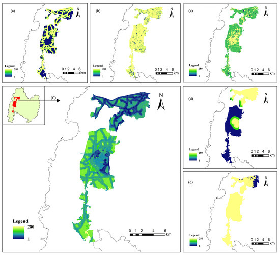 Spatial distributions of accumulated cultural ecological resistance surface in urban areas. (a) Road resistance surface. (b) Slope resistance surface. (c) Land-use resistance surface. (d) Ecological resource buffer resistance surface. (e) DEM resistance surface. (f) Accumulated cultural resistance in the urban areas.
