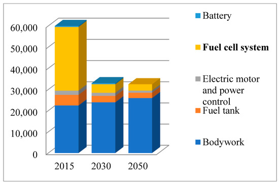 According to the 2015 forecast of the International Energy Agency (IEA), a significant reduction in the cost of hydrogen fuel cells for vehicles should occur by about 2030 (Figure 1) and should be based on technologies that have not been developed so far.