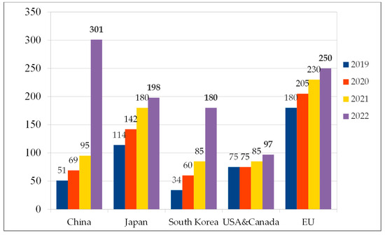 In China, along with Japan and South Korea, the development of hydrogen energy is considered one of the key development tasks; the goal is to create the world’s leading hydrogen economy in the future, including first self-sufficiency, than the export of products and services [81,82,83]. In 2015, the PRC adopted the “Made in China 2025” program, which contains one of the main goals—the accelerated development of hydrogen transport. According to the forecast of the China Hydrogen Association performed in that period, by 2025, there will be 50 thousand fuel-cell vehicles and 200 filling stations in operation, and by 2035, there will be 15 million vehicles and 1.5 thousand filling stations [84].