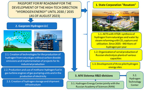 Countries and huge companies rich in natural resources, primarily natural gas, are more interested in using them to obtain hydrogen rather than using costly methods like water electrolysis, despite the greater carbon footprint of “fossil-use” methods. By 2030, according to McKinsey’s forecast (McKinsey & Company. The clean hydrogen opportunity for hydrocarbon-rich countries. URL: https://www.mckinsey.com/industries/oil-and-gas/our-insights/the-clean-hydrogen-opportunity-for-hydrocarbon-rich-countries (accessed on 23 September 2023)), due to economies of scale, the average cost of hydrogen for end-users in countries rich in hydrocarbons (Russia, USA, Gulf monarchies, Canada, Australia, China and former Soviet Middle East republics) may decrease by 2 times—from USD 7 to 3.5.
