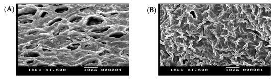 Scanning electron micrograph (SEM) has been used before and after the dye biosorption to study the distribution of CV ions on the S. muticum surface (Figure 2A,B). Algal cells were smooth with a surface greatly porous, which was hole-like prior to CV dye exposure (Figure 2A). The algal surface became meandrous and rough after treatment with CV dye (Figure 2B). This is attributed to the dye ions accumulation along the algal cell surface. The algal cell wall was very porous and readily permeable to CV ions. This can clarify the greatest affinity of S. muticum biomass for the CV dye removal. Changes in the algal surface porosity related to the biosorption of dyes were reported by Omar et al. [26] and Vijayaraghavana and Shanthakumarb [27].