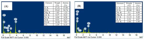 The elemental compositions of S. muticum biomass before and after CV biosorption were determined using an EDX analysis (Figure 3A,B). The data showed that carbon and oxygen were found to be the most abundant elements found in the algal biomass prior to dye biosorption, followed by calcium and, ultimately, magnesium, silicon, sulfur, and aluminum (Figure 3A). The increase in carbon weight percentage from 27.21% (before dye biosorption) to 32.11% (after biosorption) and the presence of chlorine element as a constituent of the dye structure after biosorption may be responsible for the biosorption of CV by algal biomass. Moreover, some elements in the spectrum were undetectable or reduced during dye biosorption, indicating that the process responsible for the biosorption of CV dye is ion exchange [1].