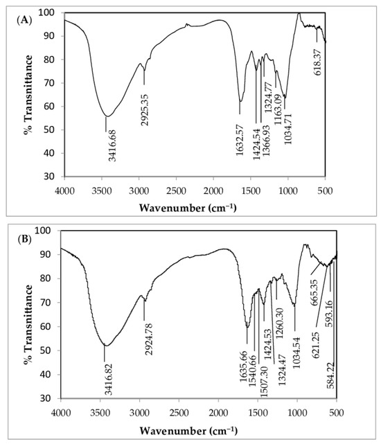 The spectrum of FT-IR of S. muticum biomass before and after biosorption of CV dye includes peaks distinguished by numerous functional groups (Figure 4A,B). The wide peak at 3416 cm−1 was recorded before and after biosorption of CV onto the algal biomass due to groups of –NH and –OH. This suggests that the biosorption of CV dye onto the S. muticum biomass is the responsibility of the hydroxyl and amine groups [18]. Intense peaks allocated to the C–H group of phospholipids and lipid fractions were observed on the biomass of S. muticum at 2925.35 cm−1 and 2924.78 cm−1 before and after biosorption of CV dye [28]. The absorption band of 1632.57 cm−1 transferred to 1635.66 cm−1 may be assigned to the C=O stretching vibration of alginic acid on the brown algae cell wall [29]. In addition, typical peaks at 1424 cm−1 and 1034 cm−1 belonging to alginate component were recorded for the biomass of S. muticum before and after the biosorption process, along with a new lipid peak containing the fraction of fucoidan (sulfated polysaccharides) was occurred at 1260.30 cm−1 for the algal biomass after treatment with CV dye, previously mentioned in the study of Pennesi et al. [30] and Marais and Joseleau [31]. As proposed by Kumar and Ahmad [32], the presence of a new absorption band at 1540.66 cm−1 in the S. muticum biomass may be due to the –CN group of the CV after biosorption. The peaks present only in the algal biomass at 584.22 cm−1 and 594.16 cm−1 after biosorption process may be attributed to the C–H stretching vibration [33]. According to the analysis of FTIR spectra, shifts in the functional groups’ position in the biomass of S. muticum after CV biosorption suggest that these groups are active in the removal of CV. A high quantity of polysaccharides is found on the surface of the algal cell; some of them are linked to proteins and other molecules [34]. These components have many active functional groups, such as sulfate, phosphate, amino, carboxyl, amine, and carbonyl groups [35]. The CV dye molecules were, therefore, incorporated with the algal biomass by association with the functional groups, as suggested by Jayaraj et al. [36].