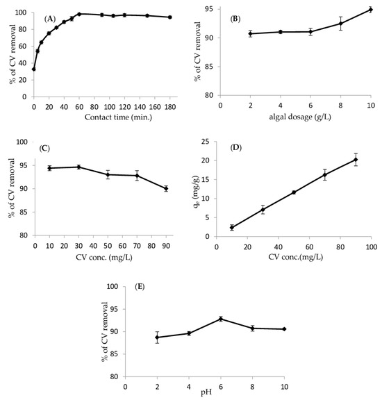 Influence of (A) Contact time, (B) Algal dose, (C) Initial conc. of CV, (D) Adsorption capacity, and (E) pH on the biosorption process of CV onto the S. muticum biomass.