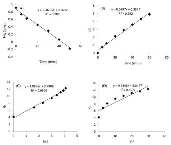 As seen in Figure 6A and Table 1, the high coefficient of determination value (R2 = 0.988) shows that the pseudo-first-order model supports the experimental data of CV biosorption kinetics. However, the experimental qe value (12.26 mg/g) is higher than the calculated value (7.39 mg/g). Thus, the pseudo-first-order model might not be appropriate to illustrate the CV dye biosorption onto the biomass of S. muticum. On the contrary, Fawzy and Gomaa [50] reported that the pseudo-first-order model was fit implemented for estimating the biosorption behaviors of Congo red dye onto the Cystoseira trinodis biomass.
