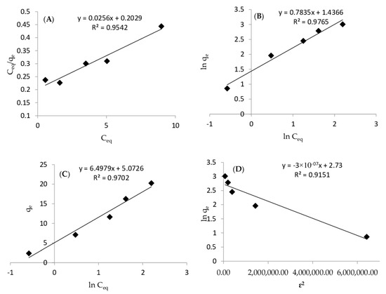 where b (L/mg) is the adsorption constant of Langmuir associated with the sorption of free energy, and qmax (mg/g) is the maximum sorption capability of the algal biomass. The values of qmax and b can be estimated from the slope and intercept, respectively, of the Ceq/qe against Ceq linear plot, as indicated in Figure 7A.