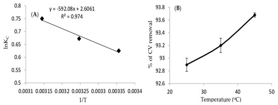 The removal of CV dye was assessed for varied temperature values of 25, 35, and 45 °C under optimized conditions of 60 min contact time, 10 g/L algal dosage, 30 mg/L initial CV concentration, and pH 6. Figure 8A shows that the removal percentage of CV dye increased with increasing temperature. The increased biosorption may be a result of both the higher kinetic energy of the CV dye molecules and the increased activity of the adsorbent surface [61]. The enhanced mobility of dye molecules and the presence of pores on the algal surface may also possibly contribute to this effect. According to Rajasimman and Murugaiyan [62], the increased temperature causes dye molecules to diffuse faster on the surface and inside the pores of algal biomass.